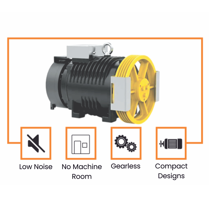 Permanent Magnet Gearless Machine for smooth and quiet motion.